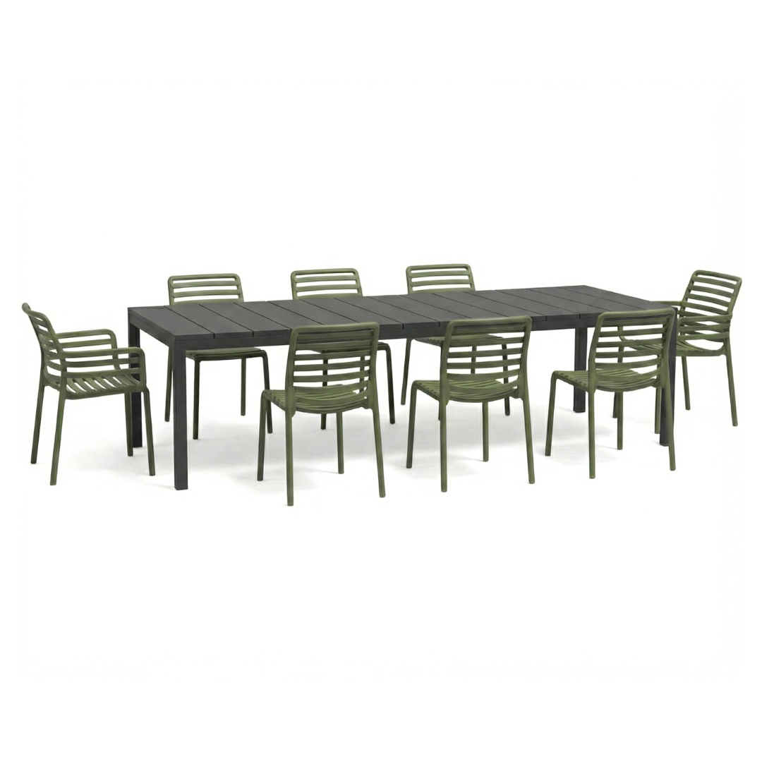 Ensemble composé de : table Rio 210/280 anthracite + 6 chaises Doga + 2 fauteuils Doga Agave.