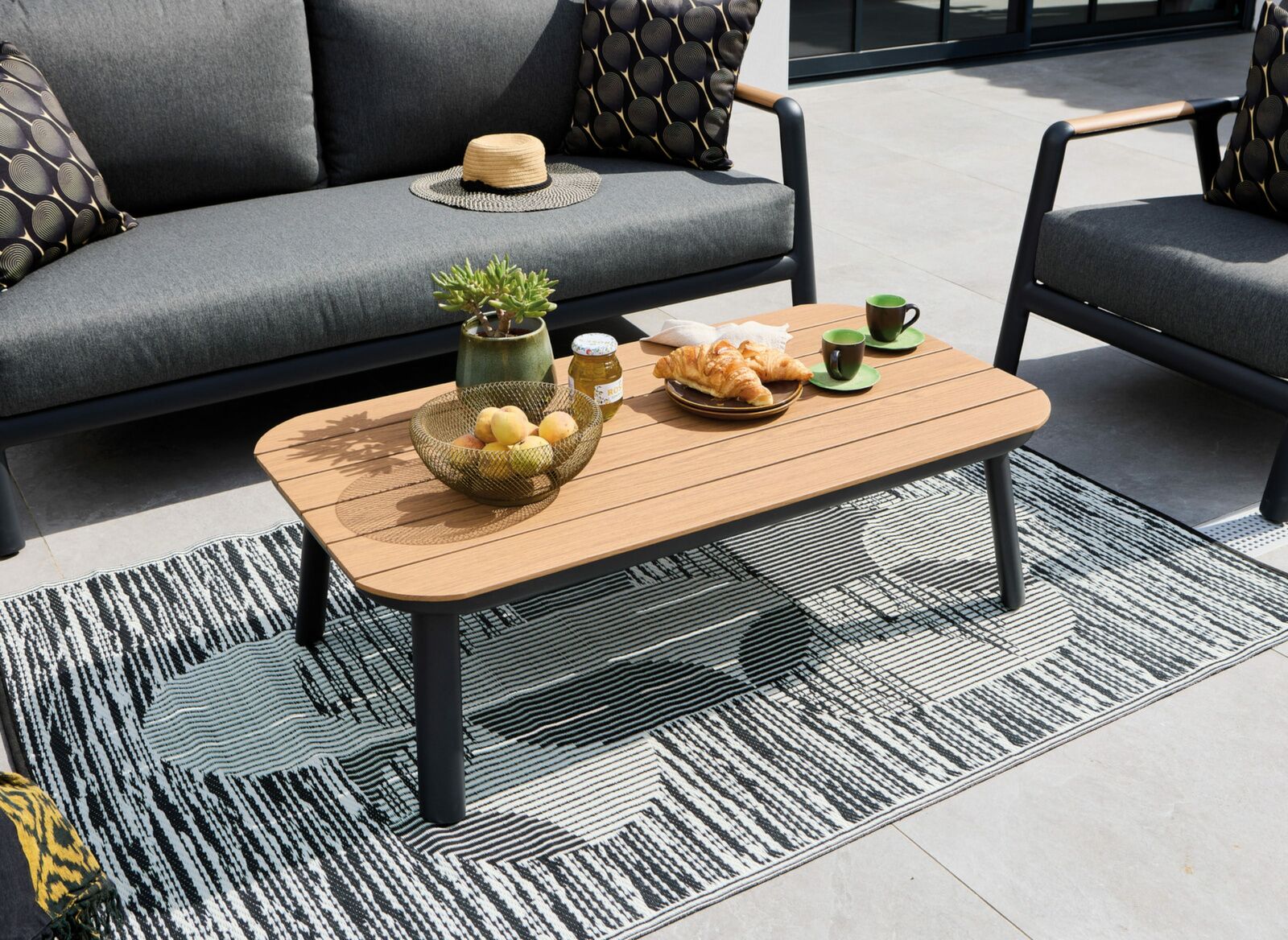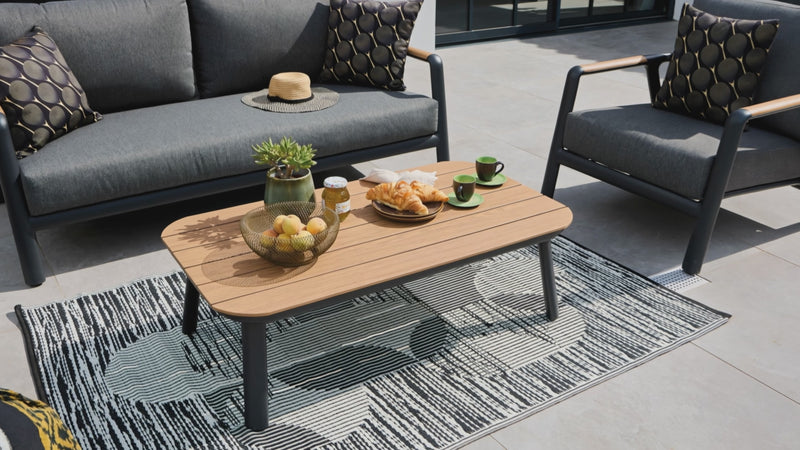 - Tipologia: Set Lounge completo (include 2 poltrone, 1 divano e 1 tavolino rettangolare)